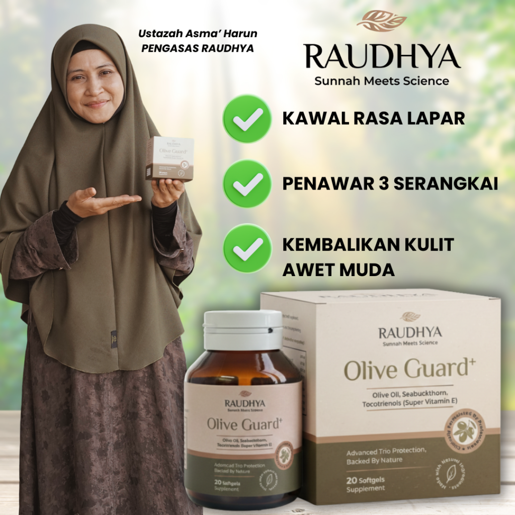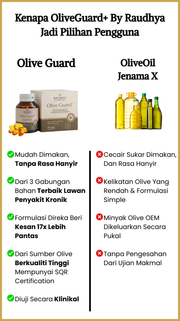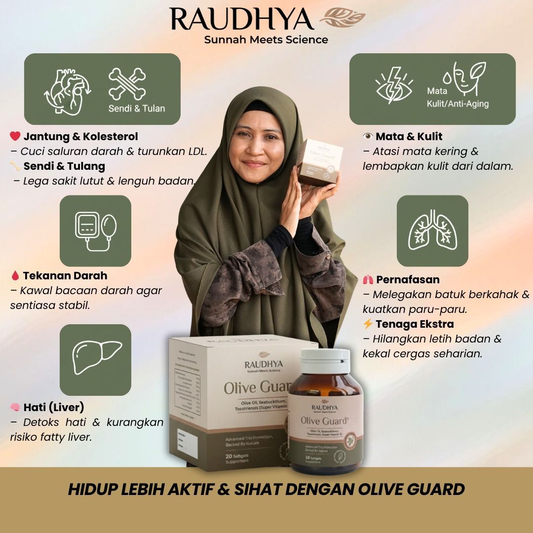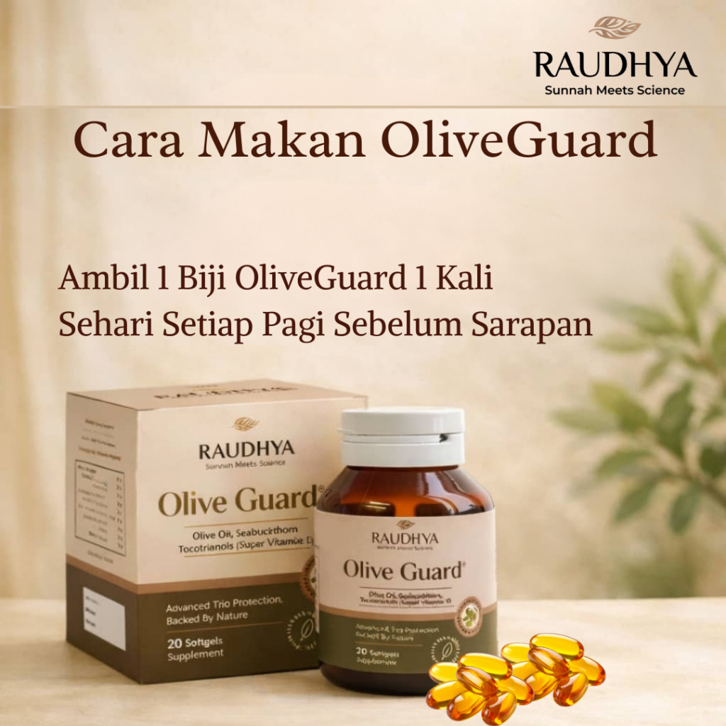 Raudhya OliveGuard+ Diperkaya Bahan Aktif Polyphenols, Tocotrienols (Super Vitamin E) & Omega Aktif Menyokong Kawalan Gula, Kolesterol & Tekanan Darah