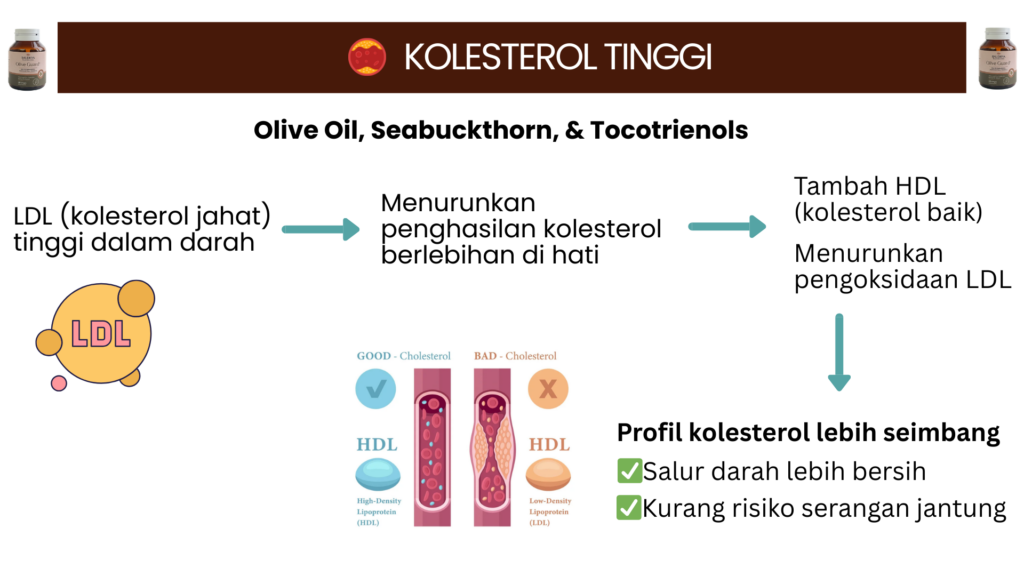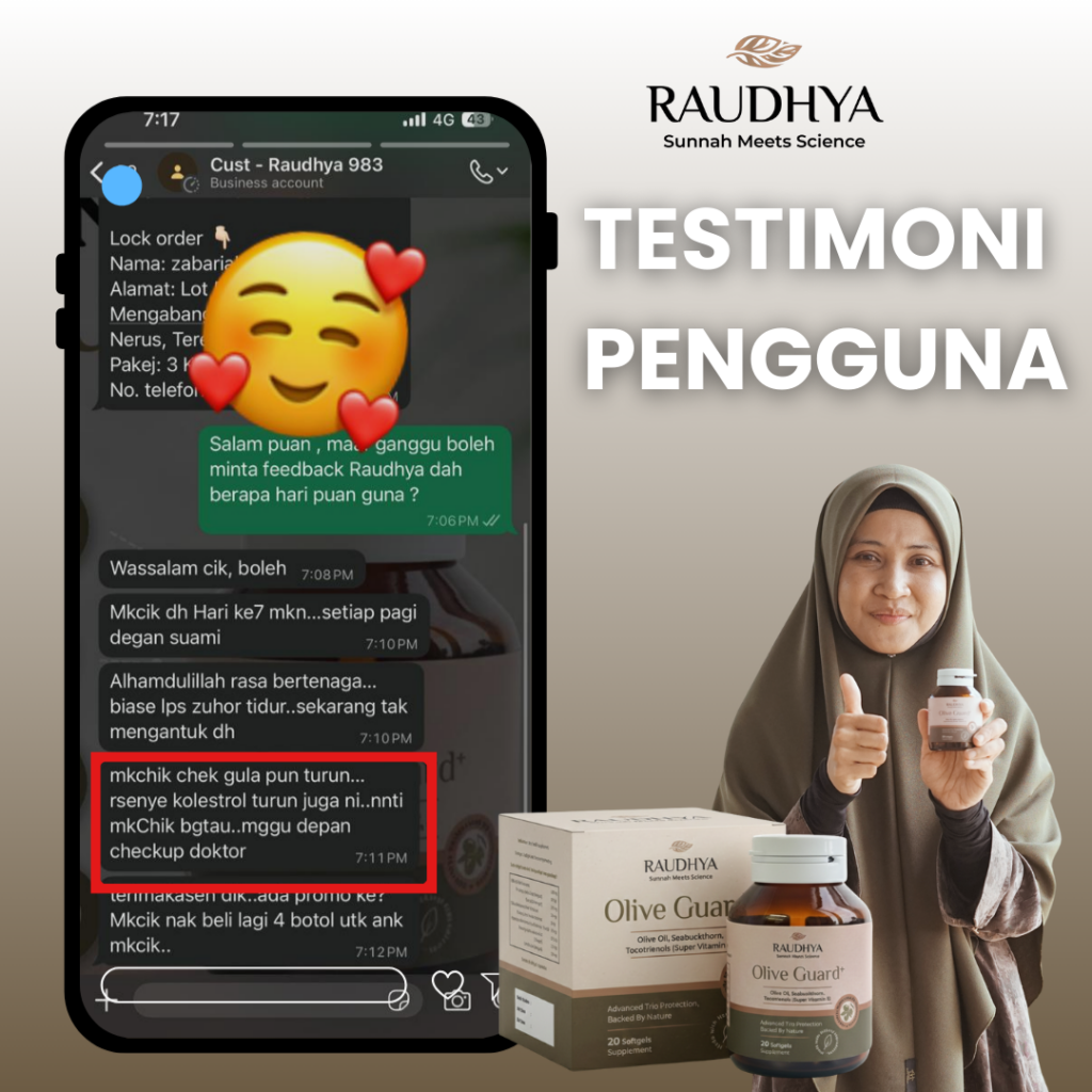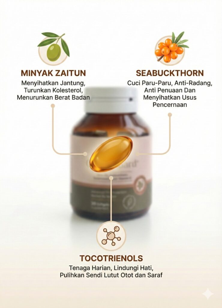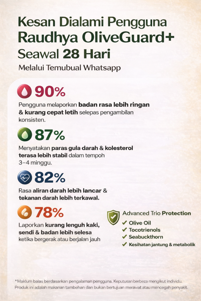 Raudhya OliveGuard+ Diperkaya Bahan Aktif Polyphenols, Tocotrienols (Super Vitamin E) & Omega Aktif Menyokong Kawalan Gula, Kolesterol & Tekanan Darah